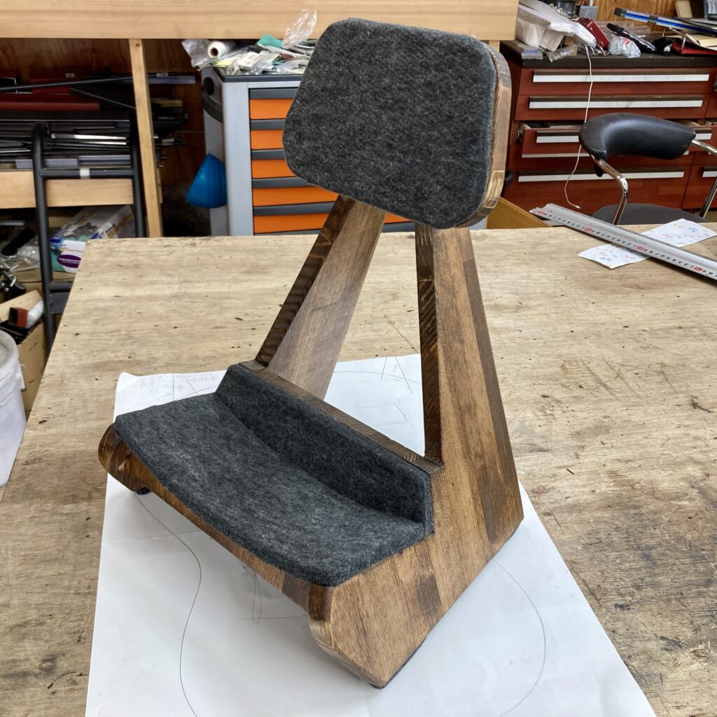 ご依頼内容 オリジナルギターラック制作のご依頼です。 対応内容 サンプルの写真をもとに、通常より小さいサイズのギターに合わせて制作しました。 素材 集成材、極厚フエルトを使用しました。 こだわりポイント 使用しているギターを型どりし、底面の局面... -